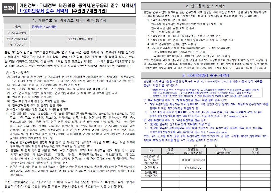 이에 따라 기존 '개인정보·과세정보 제공·활용 동의서'와 '연구윤리 준수 서약서' 외에 ‘나고야의정서 준수 서약서’가 새롭게 추가되었음을 안내드립니다.